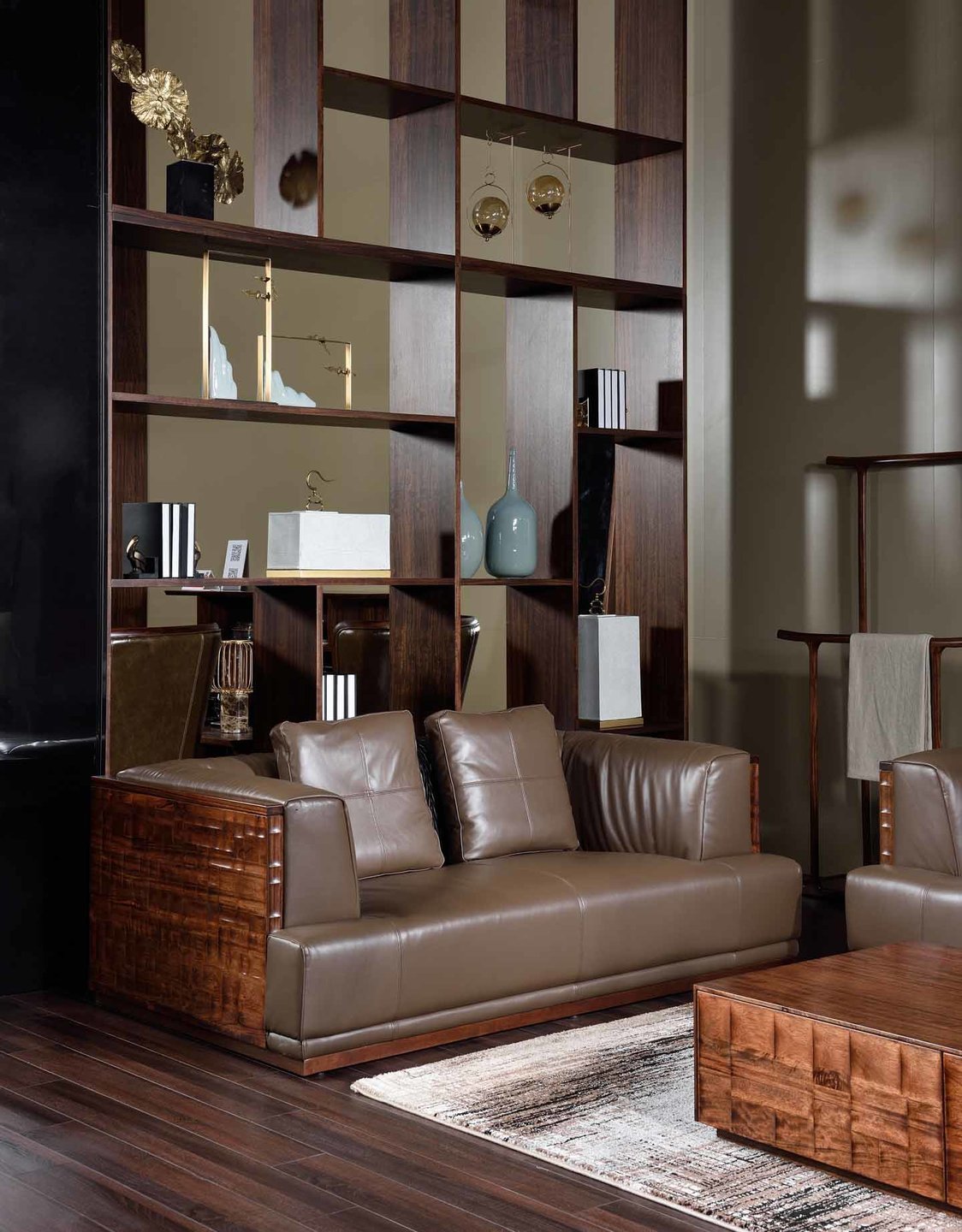 The Hampton Sofa features a solid wood frame, walnut finish, uniquely intricate detailing and leather upholstery.