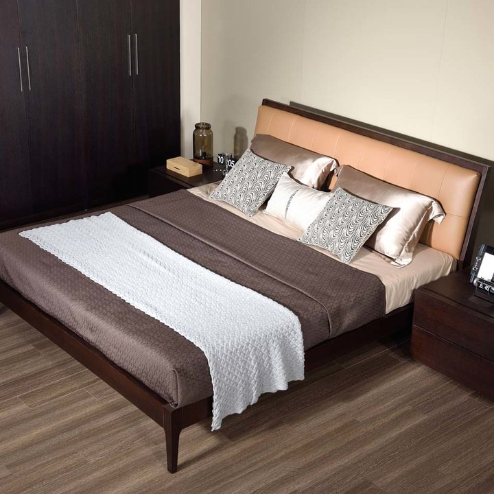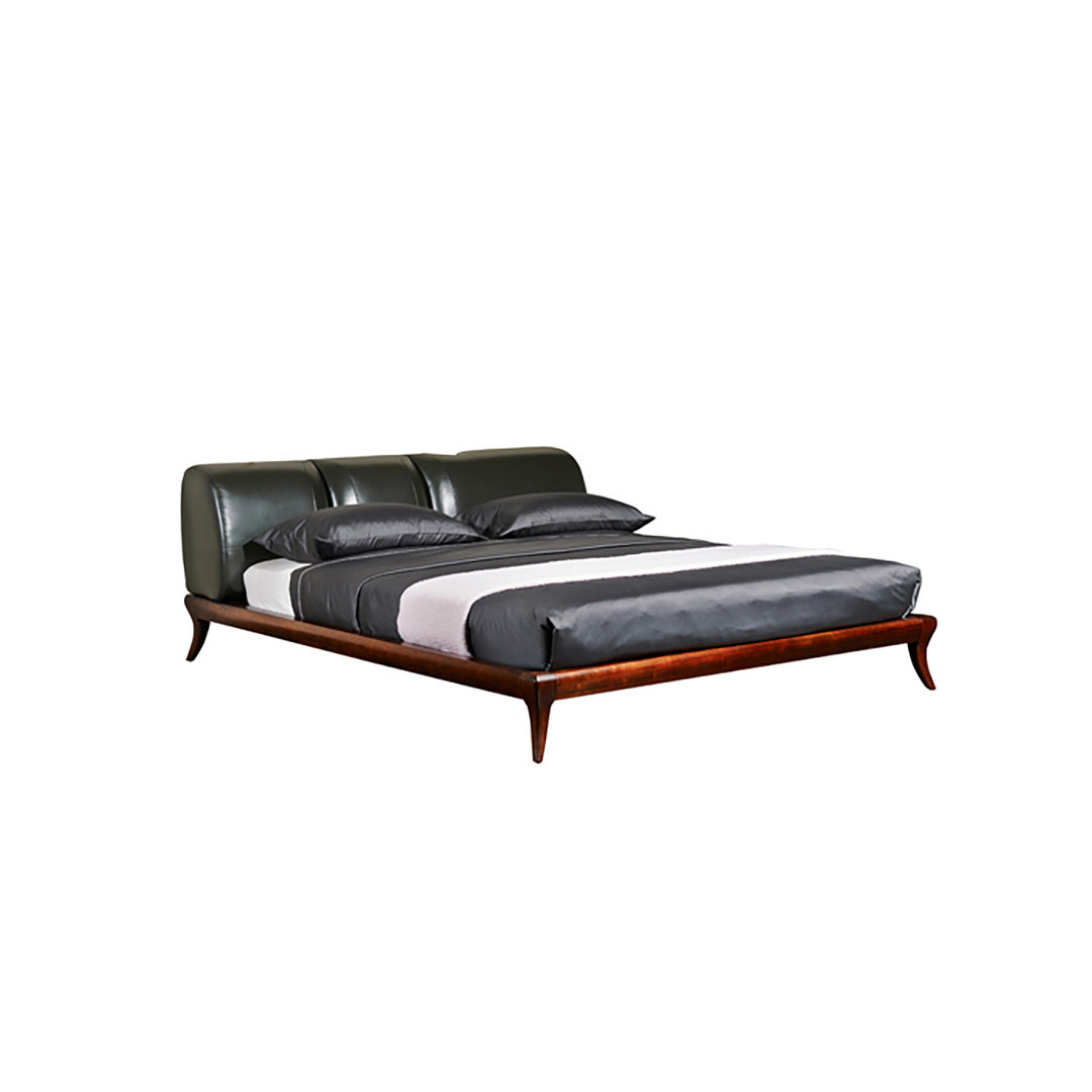 The Knight Bed has a solid, masculine form and detailed headboard edge. Leather upholstery and walnut finish.